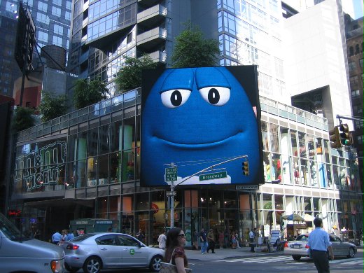 直到有天在時代廣場附近某條街等紅綠燈時,無聊之際抬頭看泰山壓頂閃爍不息的跑馬燈,才赫然發現 M&M's 巧克力的大圓臉,就在對街的大螢幕上對我齜牙列嘴地笑著! 哈! 原來你在這裡啊?!