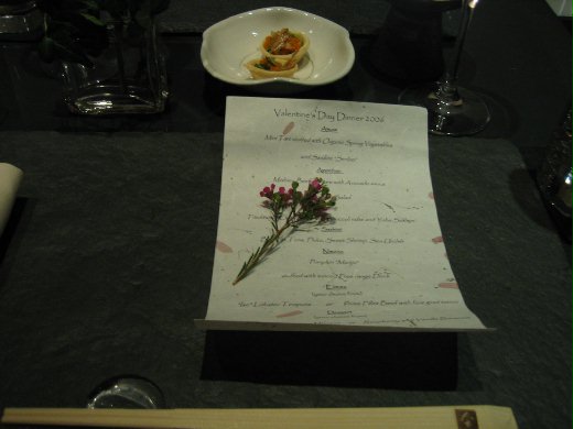我們點的套餐從前菜到甜點一共七道,很有法式的作風。菜單是捲成圓筒狀,並用稻草綁上一束小花,放在桌子上等待客人的青睞。打開一看,每道菜的名字和食材,都詳細列印在一張綴有花瓣和樹葉的手工紙上。What a