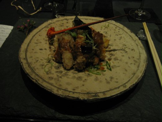 食材和料理手法是日、法兼具,創意十足,例如在日式 yube(擷取豆漿最上層的嫩皮)湯灑上一大片金箔,日式南瓜 manju(口感有點像湯圓)包烤鴨肉佐綠茶汁、日式牛肉淋上溶化的鵝肝醬、加了蓮藕青蔥的法式 quiche 等等,每一道菜都讓我讚嘆連連。