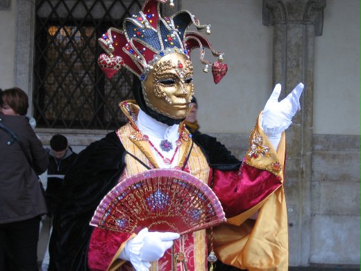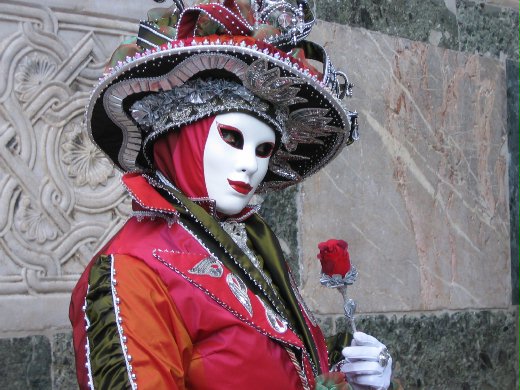 在這段期間,整個威尼斯儼然成為一個露天的宮廷化妝舞會,不管本地人或觀光客、男女老幼、環肥燕瘦都可以裝扮自己,漫步在充滿古典氣息的威尼斯,享受路人欣羨驚奇的眼光,頗有大明星走紅地毯的感覺。我想最吸引人之處,莫過於暫且擺脫自己真正的身份,進入另一個時空吧!