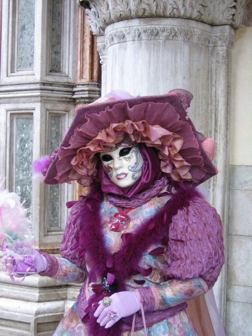 我不至於那麼鴨霸,只是喜歡擠到專業攝影師旁邊看看他們取什麼樣的鏡頭。幾次下來還真的是獲益良多。他們喜歡近距離拍模特兒的大頭照,如此可以清楚看到面具或頭飾上的 details,而且大頭照的背後都是雄偉的教堂建築或漂亮的雕樑畫柱,讓人一看就知道是威尼斯的嘉年華。之後我在很多明信片和月曆上都看到這樣的取景,很有震撼力。其實,在人潮洶湧的威尼斯,不這麼拍還真沒辦法把探頭探腦的閒雜人等從鏡頭中刪除哩!