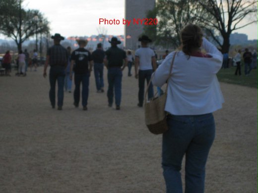 我趕緊拿出相機,跑到他們後方拍照,鏡頭上有華盛頓紀念碑做為背景,構成一個有趣的意象。他們一行同時引起其他人的注意,有個女生也跟我一樣追著他們從背後拍照!