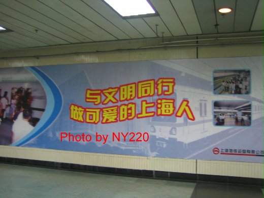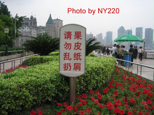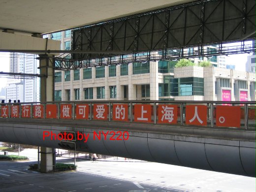 為迎接 2010 年的世界博覽會,上海卯足全力提升城市的形象,所以處處可以看到呼籲人民講禮儀、遵守交通規則、維護環境清潔的口號。諸如「紅燈停、綠燈行」或「果皮紙屑、請勿亂扔」之類的標語,也讓我不禁想起像二、三十年前的台灣。