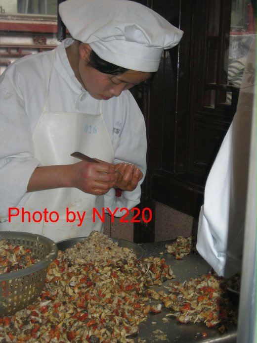 我不敢想像這些女孩每天要挖多少蟹肉,才能供應需求不斷的小籠包。光看那些細瘦的蟹腳和紅硬的蟹殼,就知道困難度很高。如果不是因為人工便宜,這樣挖豈不是太沒效率了?
