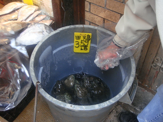 我回過神後,又在同一家店看到鱉,忽然想起上星期有個朋友在 Facebook 上,貼了個在自家游泳池 "放生" 烏龜的家庭錄影帶。他的大意是說他跟女兒在中國超市買了一隻大烏龜 (我猜應該是鱉) 回家,拯救其免於老饕之口。好笑的是其他人的熱烈回應都忘了讚揚他保育的善意和教育意義,而是紛紛警告他游泳池的水會致烏龜於死地。我在想要不要回 po 這張鱉照片給友人呢?