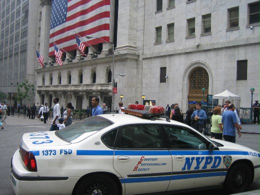 離世貿遺址不遠的華爾街,近年來一直都是警車處處見(不是在拍電影),安全戒備滴水不漏。