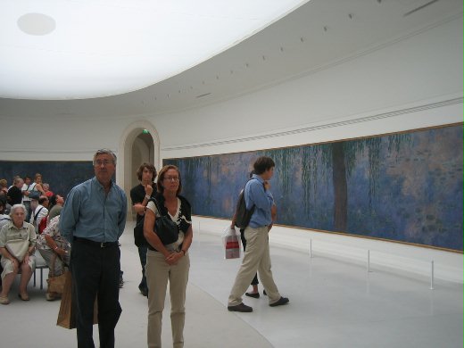 裡面有兩個橢圓形的展覽廳,每一廳各在牆上掛了四個巨幅的睡蓮,午後的陽光從天窗灑入室內,讓人彷彿置身莫內故居 Giverny 的蓮池中,想像自己是被睡蓮團團圍繞的藝術家。我壓根兒沒想到是這麼壯觀的景象,所以還深感震撼,愣了一下子。雖然大家都說莫內的睡蓮有日本的味道,但第一眼看到這些長條巨幅的畫,讓我不由得想起「清明上河圖」。