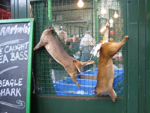 倒是生鮮肉品區的山珍海味比較吸引我的注意,除了各種魚類外,在這裡還可以看到一些美國沒有的「野味」,非常 exotic。一開始還少見多怪地驚奇於英國人在這方面也跟法國人一樣 adventurous 有冒險精神,後來想想他們自古以來盛行打獵文化,吃野味應該也是理所當然吧!