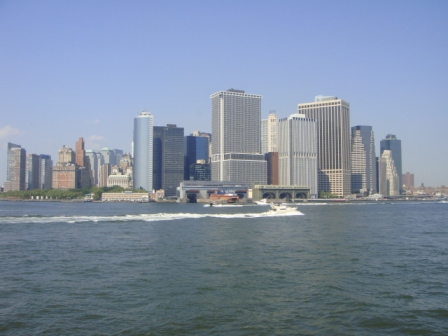 曼哈頓島的最南端近在咫尺 (這部分統稱為Lower Manhattan曼哈頓下城,就姑且稱之為金融區吧,九一一以前可以看到世貿大樓矗立其中。反正這坨大樓不是有帝國大廈和克萊斯勒大樓的 Midtown Manhattan曼哈頓中城,不要搞錯了)