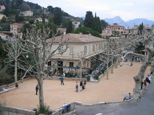 下山的時候在城門外看到一群人在玩南法經典的 boules (petanque),原來簡單的遊戲才是最能帶來樂趣,也最經得起時間的考驗。這遊戲兩個人就可以玩,先由某人「開球」,把一顆有顏色的小球 (cochonnet) 丟出去當基準,然後每個人就依序把自己的金屬球丟出去,誰的球最靠進基準小球,誰就是贏家。我們外行看熱鬧,丟球的訣竅好像是要手掌向後往前丟。