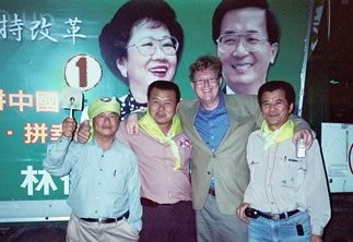 Gries是美國外交官之子,他曾受邀觀察台灣2004年總統大選,圖為Gries與陳水扁支持者站在站在台南市競選看板前。