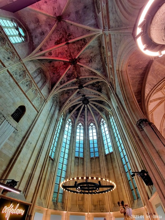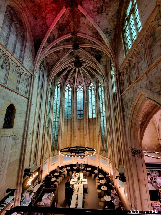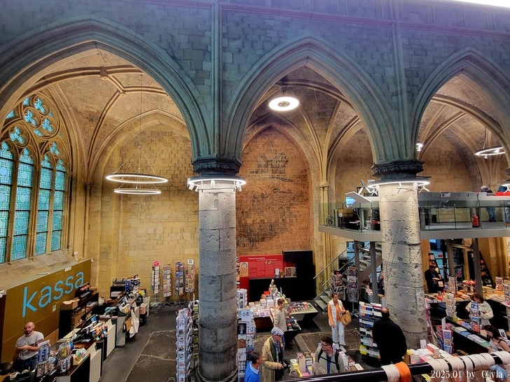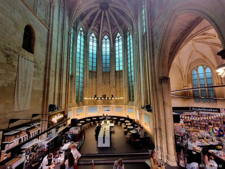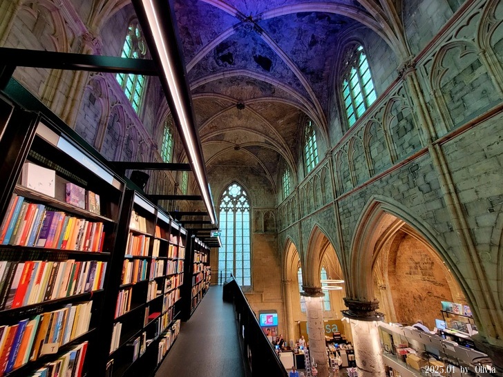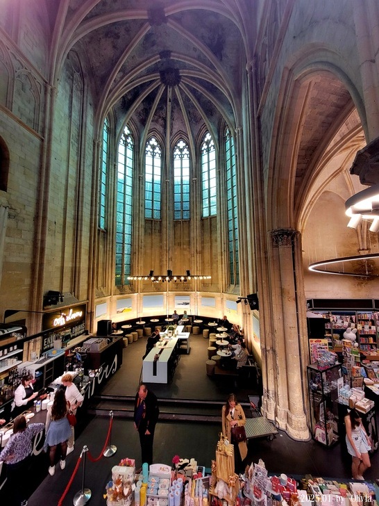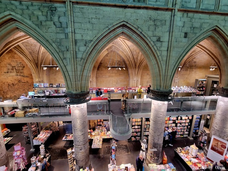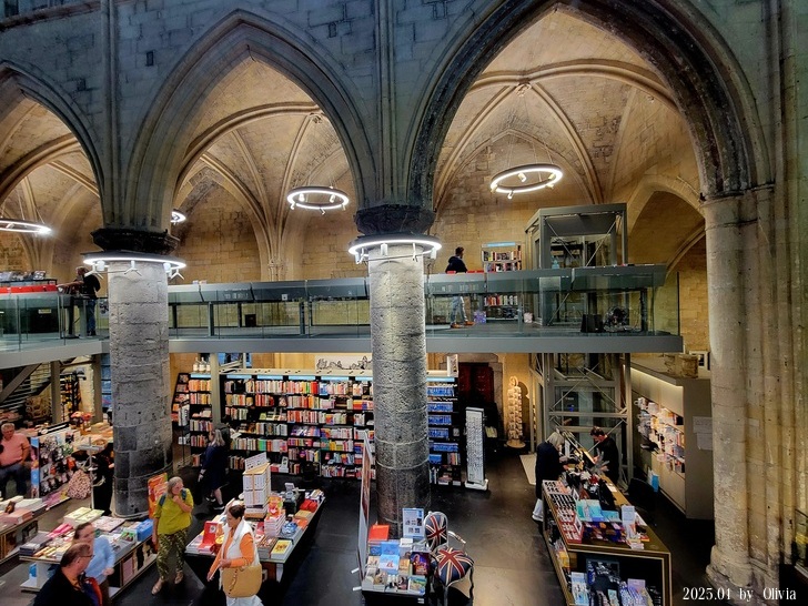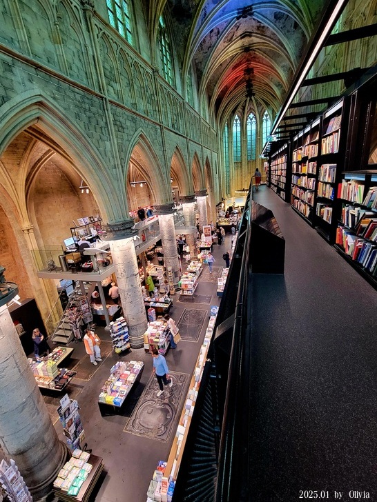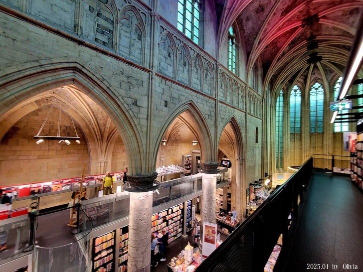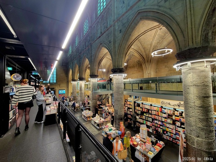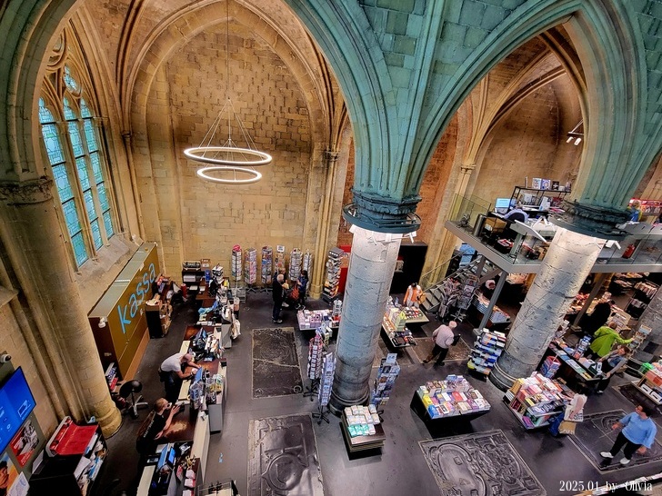 從二三樓的位置向下看,能看見咖啡廳的閱讀書桌設計成十字架造型。如此用心良苦,創新同時保持古典的設計,也成功的讓 Merkx + Girod 事務所在 2007 年獲得 Lensveld de Architect 室內設計獎,英國《衛報》評價其為世界上最漂亮的書店。這間教堂雖注入新生命,卻不失當初的莊嚴;來到此書店不管是參觀建築,買書,或享用一杯咖啡,都能在壯觀中感到平靜。(取自TRIP)