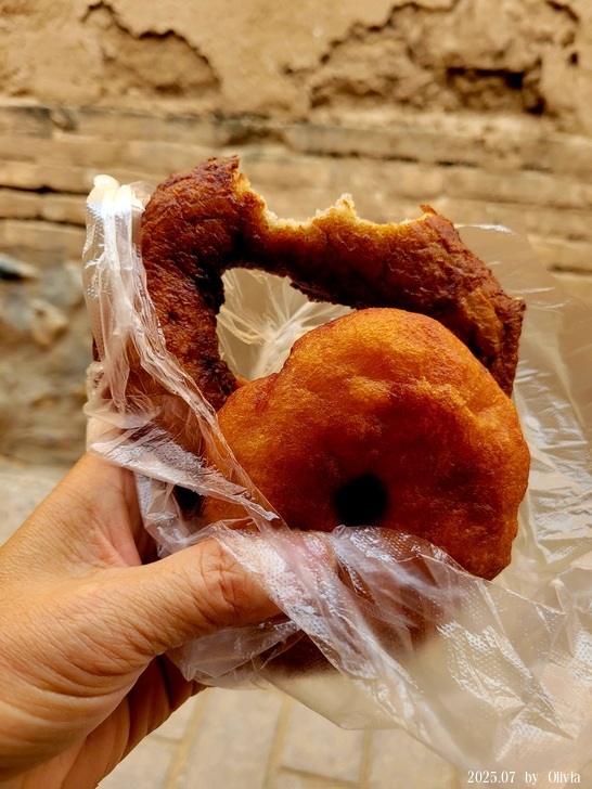 以為是甜甜圈,但口感較紮實,且店裡不賣飲料(豆漿之類)有些乾。因不習慣邊走邊吃,看店前有個小桌椅便問老闆是否可坐下來吃,咬了2口才想到拍給同學看。