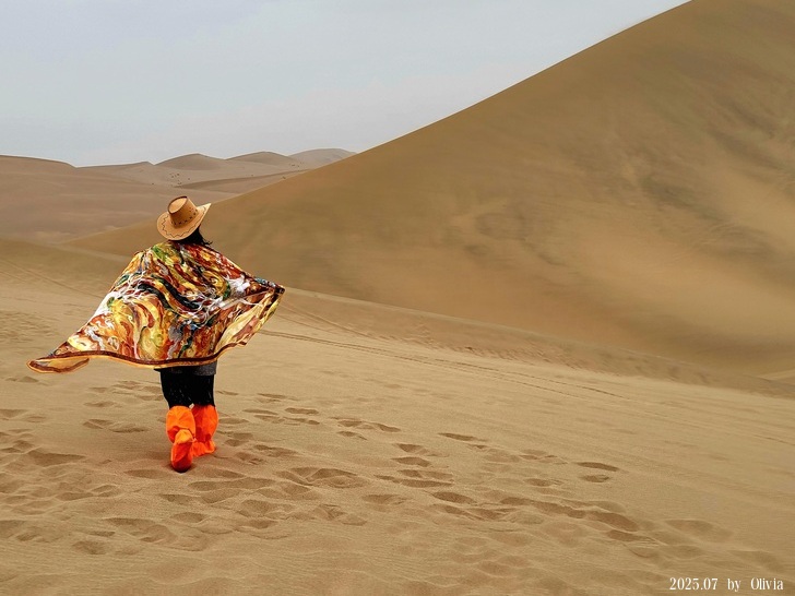 而在鳴沙山會拿它出來當拍照道具,是出發前朋友要我帶條絲巾,說拍照起來會很漂亮,心想在越南下龍灣看到大陸遊客拿著絲巾拍照的畫面感覺有點...