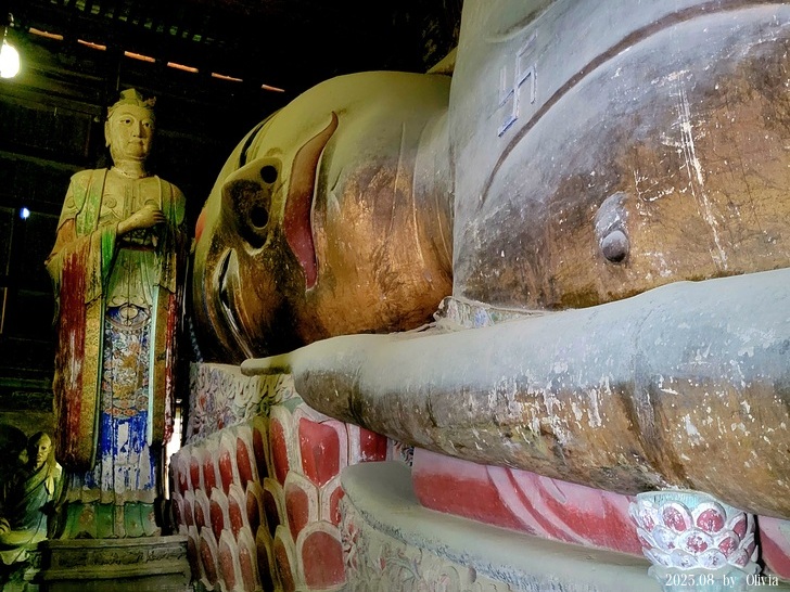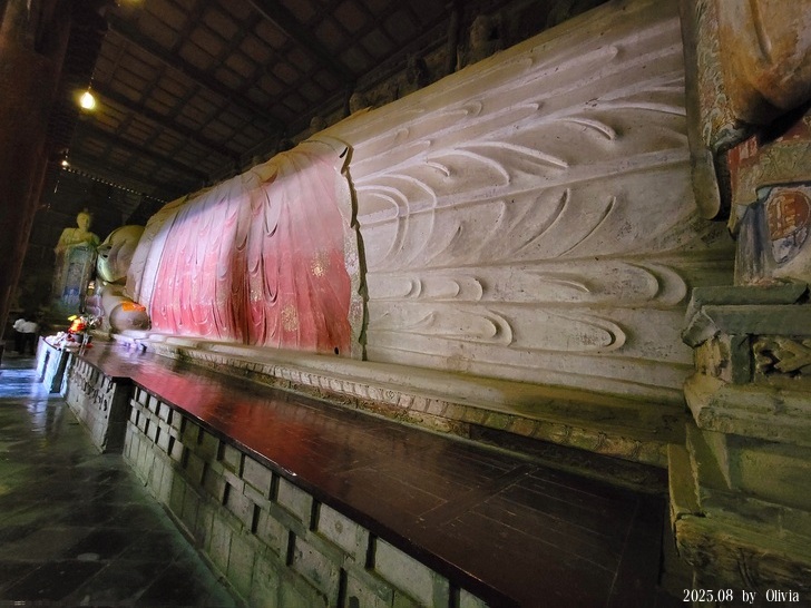 大佛寺占地約23000平方米,坐東朝西,現僅存中軸線上的大佛殿、藏經閣、土塔等建築。大佛殿面闊九間(48.3米),進深七間(24.5米),高20.2米,二層,重檐歇山頂。殿內有彩繪泥塑31具,為西夏遺物。其中臥佛長34.5米,為中國現存最大的室內臥佛像。臥佛後有十大弟子群像,旁有優婆夷、優婆塞及十八羅漢等塑像。藏經閣面闊21.3米,進深10.5米,單檐歇山頂。土塔原名彌陀千佛塔,為磚土混築密宗覆缽式塔,主塔高33.37米。(取自維基)