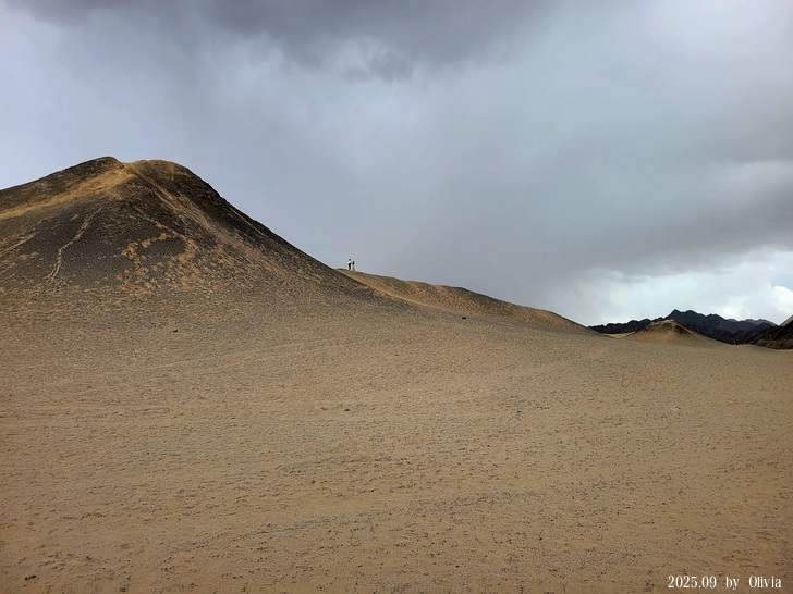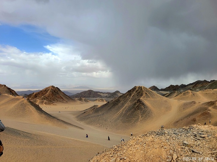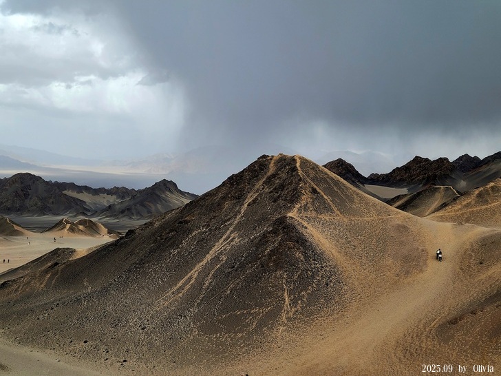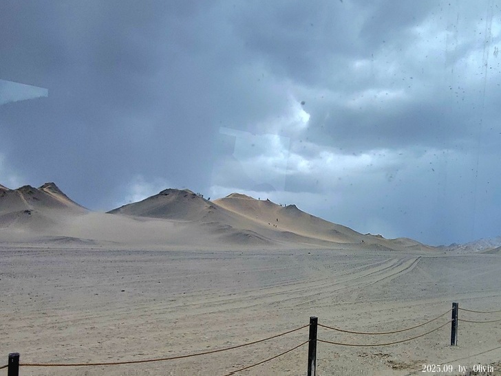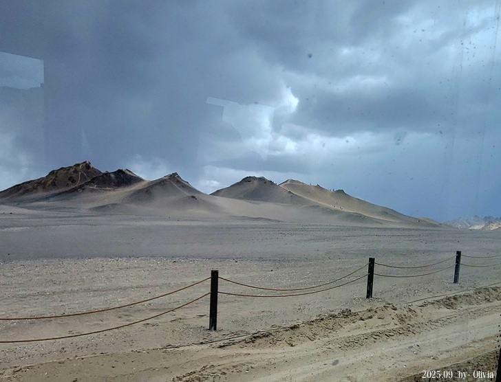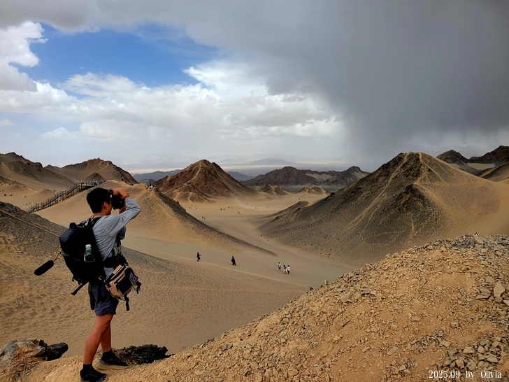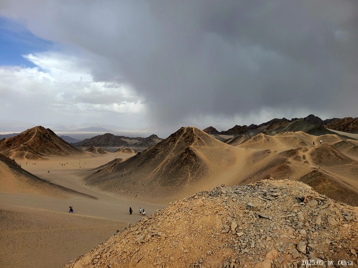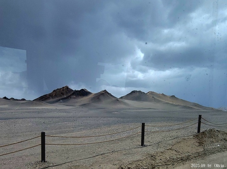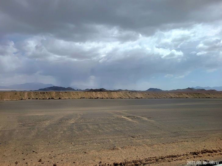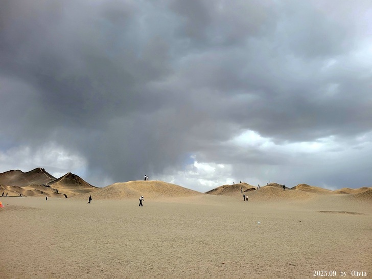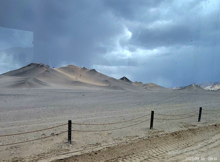 天空一邊烏雲密布、一邊晴空萬里,後來竟然淋到幾滴雨,實在太幸運了。但雷聲隆隆也挺可怕的,在西北我竟遇過幾次下雨(敦煌、天橋山,可可西里7月還下雪,冬季卻不下雪,這是什麼異世界? 太誇張了),實在不可思議(可以查查他們的年雨量)。