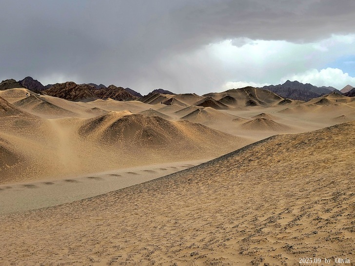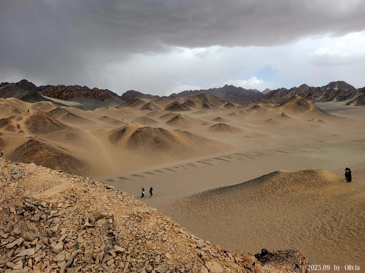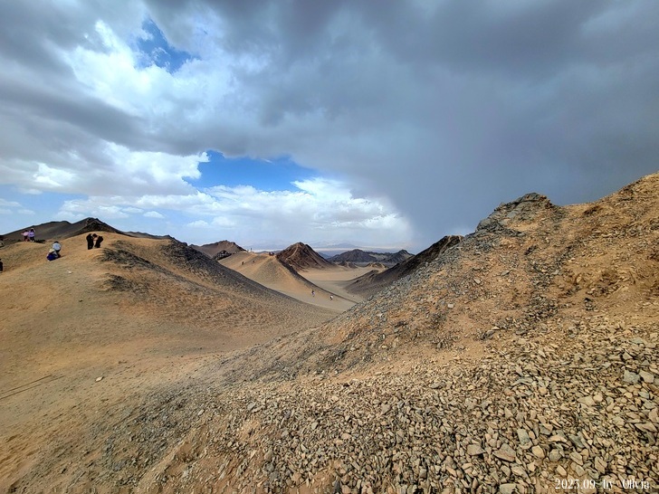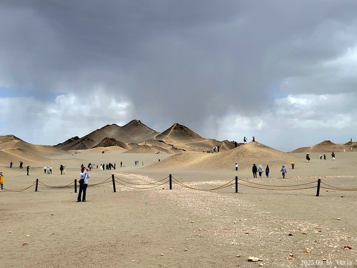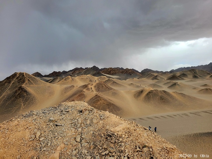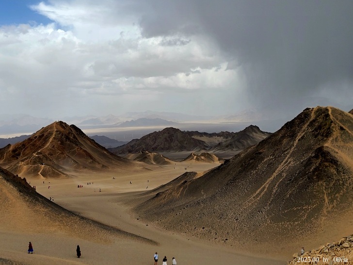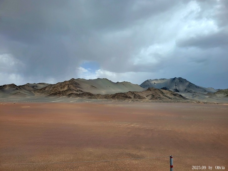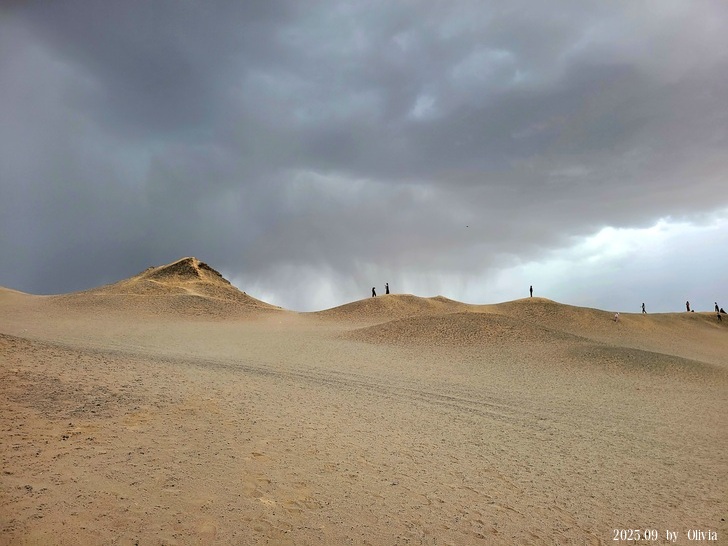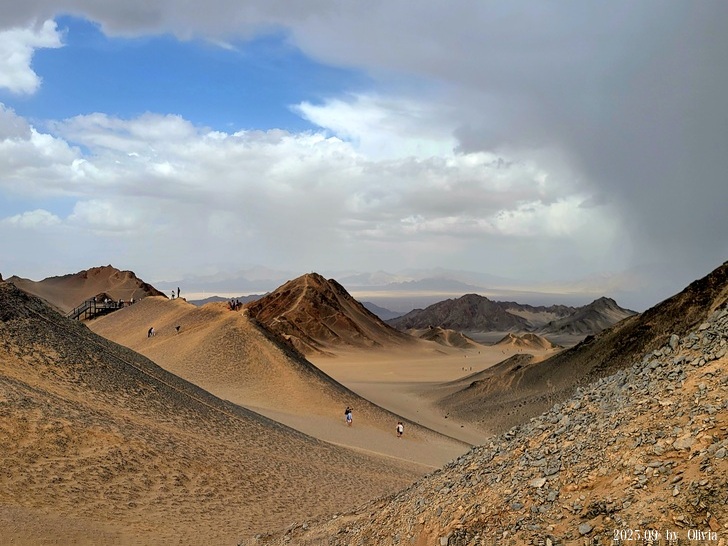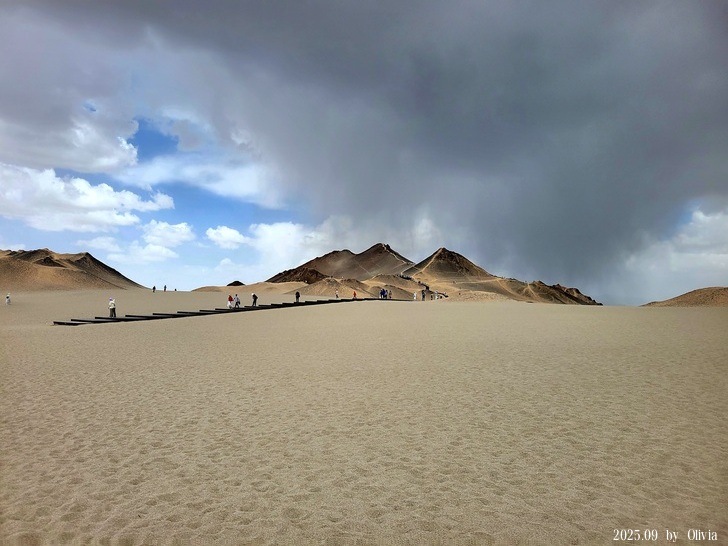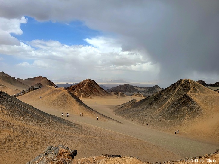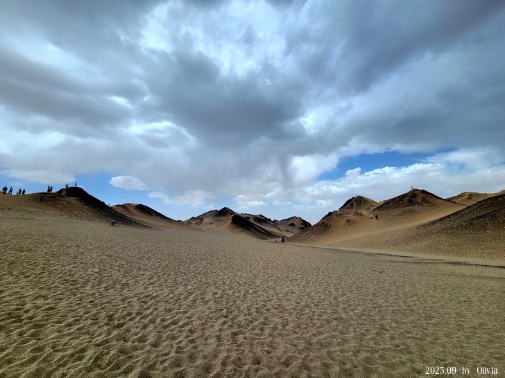 天空一邊烏雲密布、一邊晴空萬里,後來竟然淋到幾滴雨,實在太幸運了。但雷聲隆隆也挺可怕的,在西北我竟遇過幾次下雨(敦煌、天橋山,可可西里7月還下雪,冬季卻不下雪,這是什麼異世界? 太誇張了),實在不可思議(可以查查他們的年雨量)。