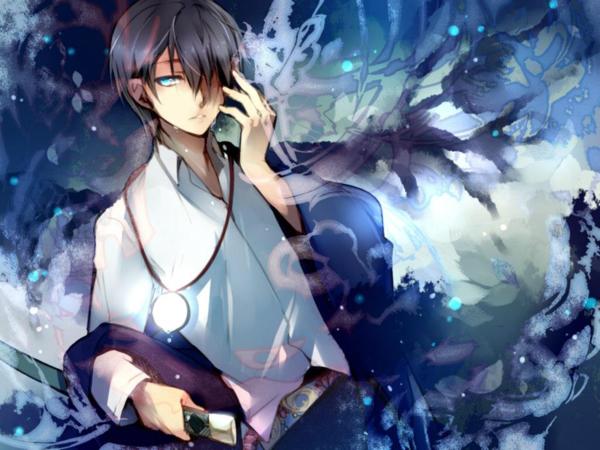 容貌:深蓝色短发,其中一边的头发遮住左眼,拥有浅蓝色的双瞳,属于悲伤帅气型。