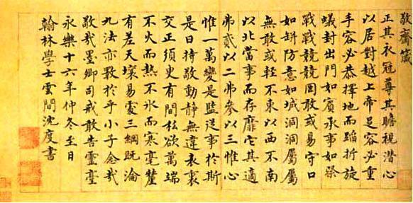 沈度(1357年-1434年),字民則,號自樂,明松江府華亭縣(今上海市松江縣)人,明代著名書法家,被明成祖朱棣譽為「我朝王羲之」。