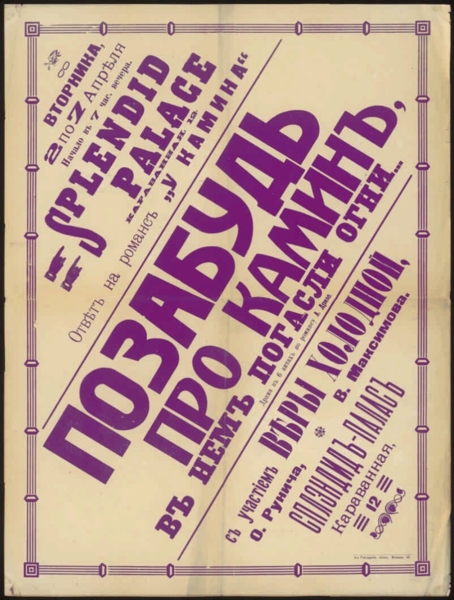 1917年11月(十月革命時) 薇拉主演與[U kamina/緊靠壁爐]同風格的«Позабудь про камин, в нём погасли огни…/忘掉壁爐, 火光已滅…» 票房不因革命影響 更加賣座