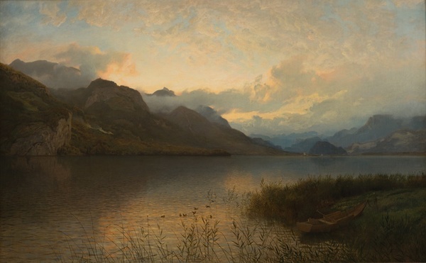 但在技巧上有些難處 因而與阿道夫.蒂得曼(Adolph Tidemand, 1814-1876)在某些作品合作
