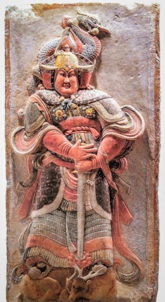 長方形曲陽漢白玉石上高浮雕而成。高113.5、寬58、厚11.7釐米。身著鎧甲,手持寶劍,立于牛形鹿角怪獸之上,頭頂鳳鳥含珠。應是佛教護法神的天王形象。