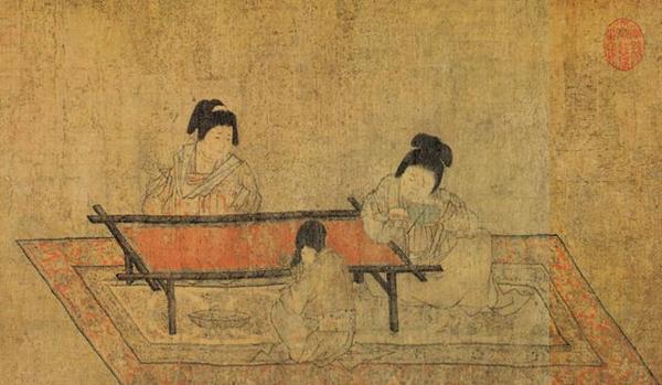 第四段為“圍繡”,共三人:其中一婦女手持團扇,倚躺在繡床邊,仿若有些倦態,其餘兩女則隔繡床對繡。
