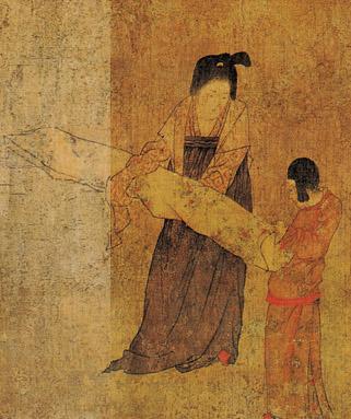 第二段為“端琴”,共兩人:一個較高的婦人抱著一張琴,另一個侍女正在協同她解囊抽琴。