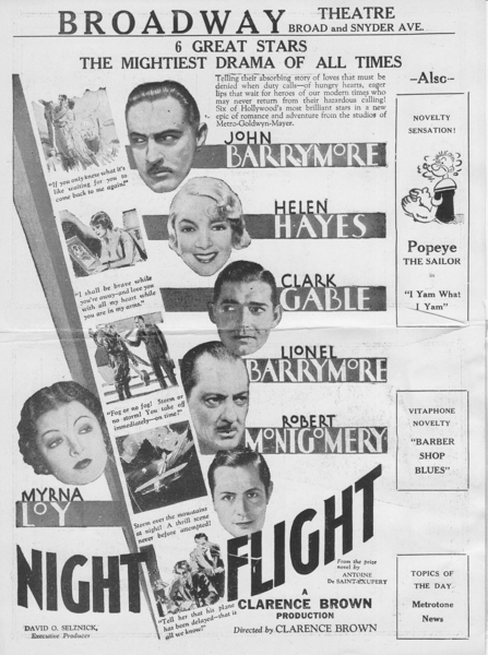 在1932年全球大紅的[Grand Hotel/大飯店], MGM陸續推出許多全明星電影, 其中一部是[Night Flight/夜間飛行]。