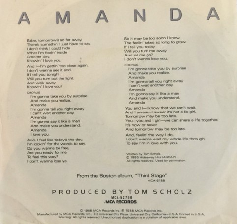 [Amanda]登上Billboard單曲榜王座(1986年終#50),成為波士頓事業唯一美國冠軍曲