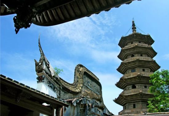 八角各有翹脊,脊端各坐鎮塔佛一尊,七層共計56尊。