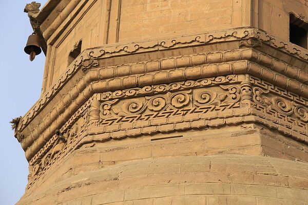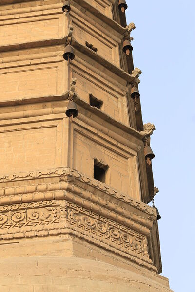 每級每角均有翹起的磚刻小龍頭,下系風鈴,隨風飄蕩,聲清音脆。