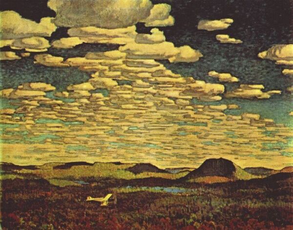 在《火勢席捲的阿爾戈馬》(Fire-Swept, Algoma,1920)中,藍色和綠色的斑塊勾勒出背景中的山丘,而前景中則詳細描繪了被燒毀的森林的遺跡。