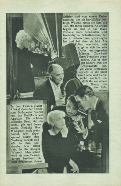 講述布達佩斯音樂廳藝人莎拉是個心懷不滿的酒鬼,受到許多男人的追求,卻與小說家卡爾索爾特住在一起。