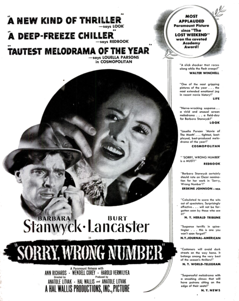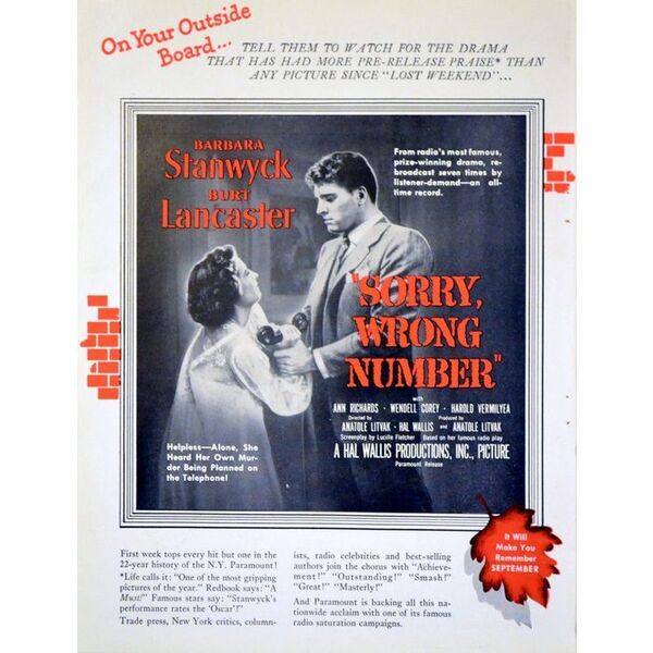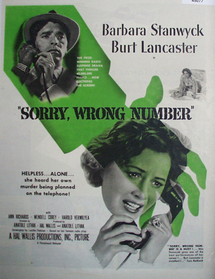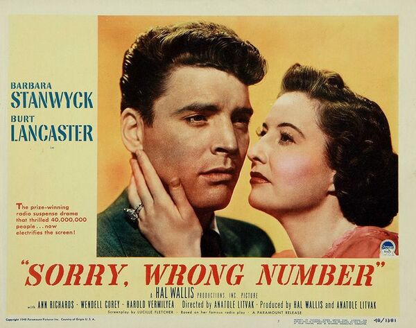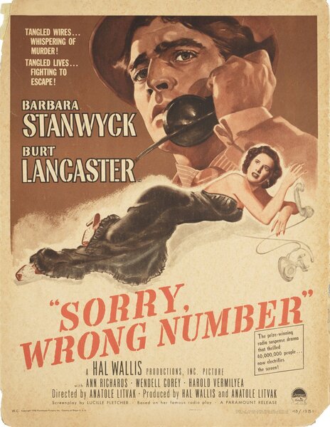 昨天在派拉蒙上映的[Sorry, Wrong Number]的寓意是,永遠不要把女人單獨留在有電話的房子裡,特別是如果這個女人是一個緊張、易激動的人……