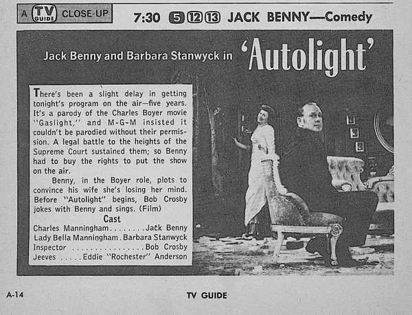1959年1月11日,芭芭拉主演的CBS電視影集[The Jack Benny Program]第九季第九集[Autolight/汽車燈](喜劇)播出.
