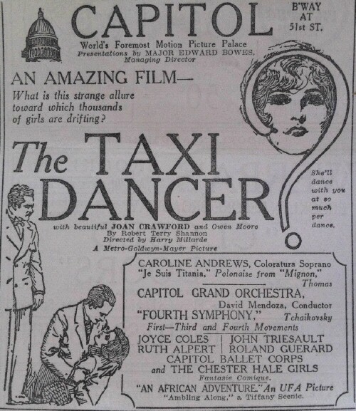 出租舞者並不是指在計程車頂上跳舞的人,也不是在計程車裡跳來跳去的人,而是指專業舞者,她們以一角錢的價格跳探戈、華爾茲或查爾斯頓舞,其中一半收入捐給為她們提供舞池和製服的機構。