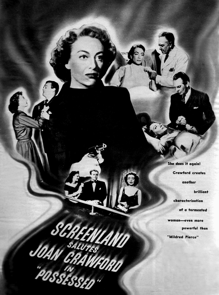 在德國流亡導演Curtis Bernhardt執導的劇情片[Possessed]中,瓊克勞馥飾演一位無法區分現實與想像的精神錯亂者。