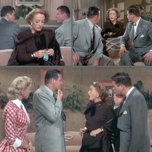 她不由自主地開始說起她銀幕形象典型的陳詞濫調、誇張的演講(本例來自[慾海情魔]),並憤怒地打了傑克卡森和丹尼斯·摩根一巴掌。