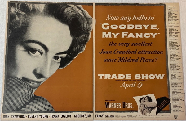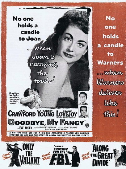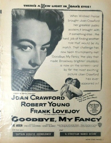 作為1930年代最耀眼的明星之一,克勞馥和她的同時代演員一樣,發現到了50年代,好角色越來越難找。離開米高梅後,她轉投瞭遠不如MGM光鮮亮麗的華納,並出演[Goodbye, My Fancy]。