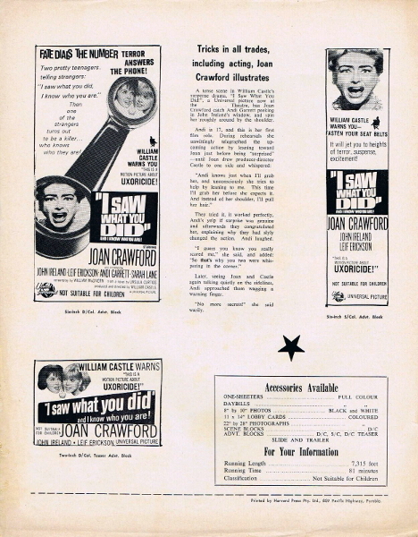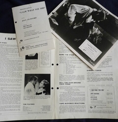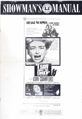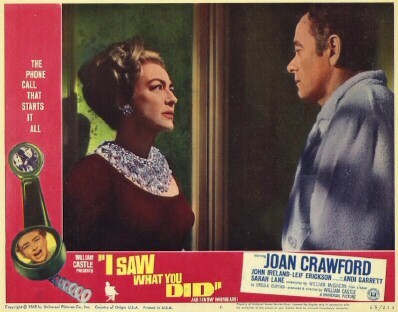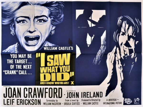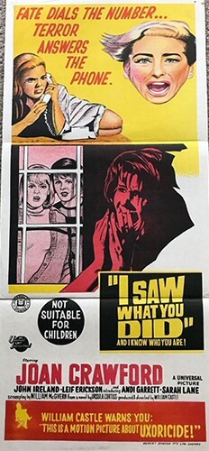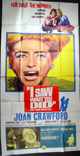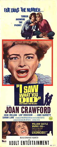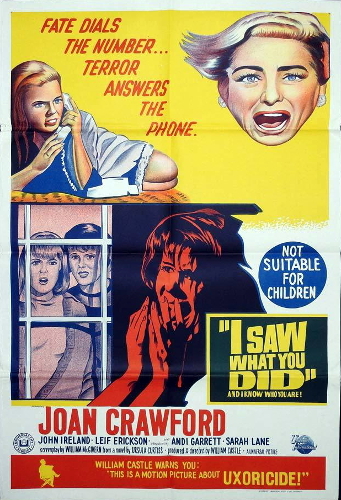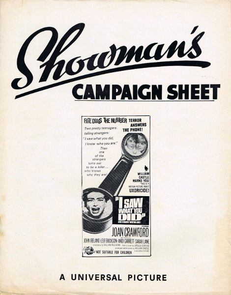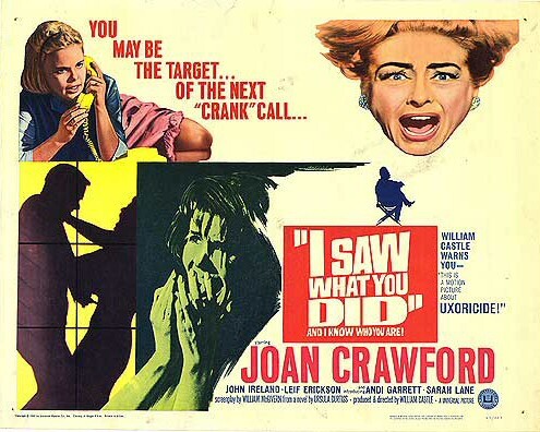 [I Saw What You Did]的廣告以真正的William Castle式的華麗風格吸引那些對詞源學不感興趣的觀眾,因為它警告他們這部懸疑驚悚片是關於弒妻的。