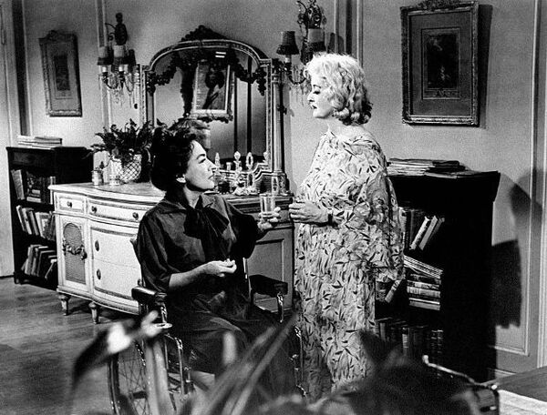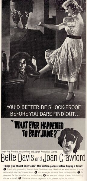 充滿活力的導演Robert Aldrich將兩位好萊塢最偉大的冰雪女王貝蒂黛維絲和瓊克勞馥聯手拍攝[What Ever Happened to Baby Jane?],這是一部針對心理恐怖的做作、哥德式的演練。