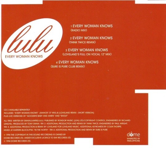 1994年,46歲的英國蘇格蘭女歌手/演員露露(Lulu)推出單曲[Every Woman Knows/每個女人都知道](Dome唱片發行)