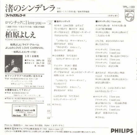 1982年4月21日, 16歲半的日本歌壇偶像歌手柏原芳恵推出第9首單曲[渚のシンデレラ/海灘上的灰姑娘](Philips Records發行)