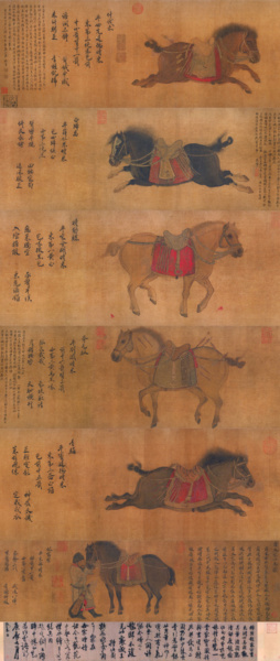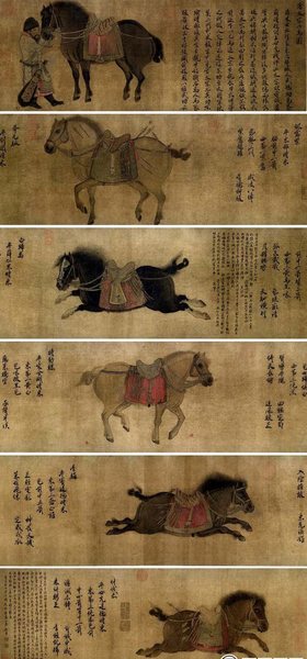 分單幅列繪唐太宗昭陵六駿:颯露紫、拳毛騧、白蹄馬、特勒驃、青騅、什伐赤,