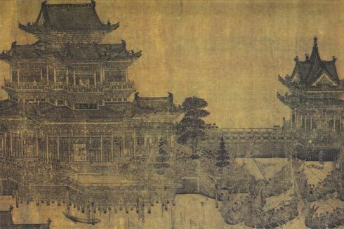 作品迎合皇室的需要,直接以宮廷建築為主題,專用墨線白描法畫建築,