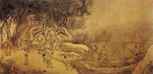 《歸莊圖》取材晉·陶淵明《歸去來兮》辭,此畫以山水為背景,人物穿插其間,在全景式構圖中,主題人物連續出現,逐段反映陶淵明辭官歸故里的主要情節,與傳稱為晉·顧愷之《洛神賦圖》同一手法。