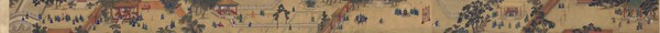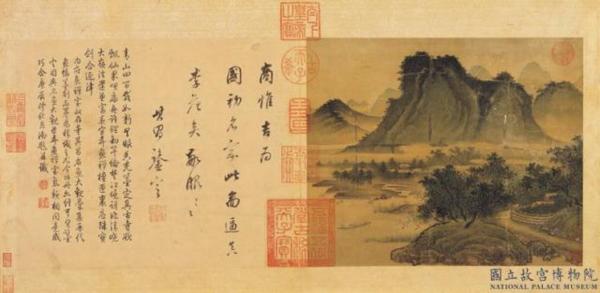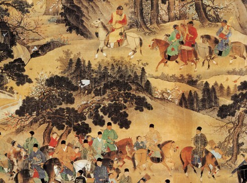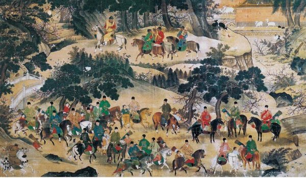 前圖寫宣宗朱瞻基遊獵情形,人物具有肖像畫特徵,四周畫山石樹木、叢林建築,場面浩大。畫法工致細膩,筆法勁健。