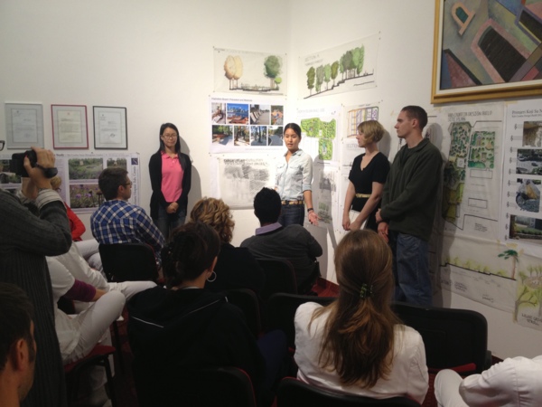 在設計時,最重要的就是筆不要停,“loosing your hand”是教授很常講的一句話。很不環保的一張張草圖紙這樣畫,把線畫順了,把型畫出來,然後加上故事情節,大家從哪裡來,為什麼來,在哪裡停留,從哪裡離開,考量與周遭環境的融合、與不同的功能結合,然後用幾條線把設計串起來,有些人用音樂,有些人用基地的溫地。接著,為設計命個名吧!名字是大家對設計作品的第一印象,名字是設計的核心概念,即使是菜市場名,還是有它背後的故事與意義。最後,要報告給業主,很現實的,表達法要很好,行銷景觀是很重要的。