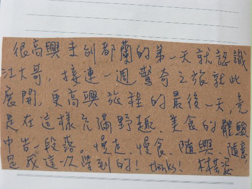 很高興來到都蘭的第一天,就認識江大哥,接連一週經其之旅就此展開,更高興旅程的最後一天,竟是在這樣充滿野趣美食的體驗中告一段落。慢走、慢食、隨興、隨意是我這次學到的!Thanks! 林藝姿
